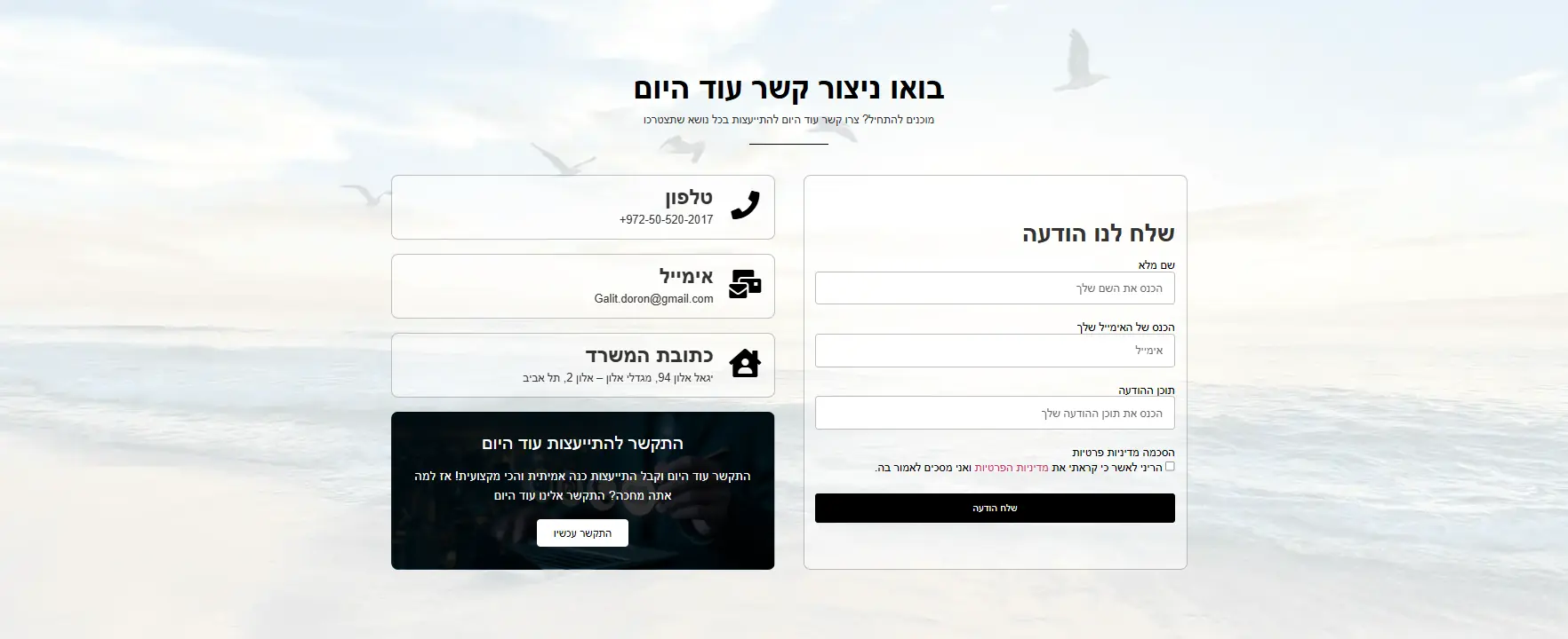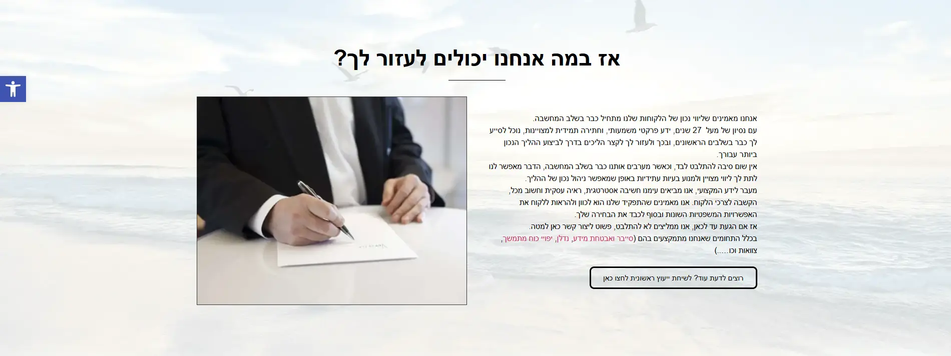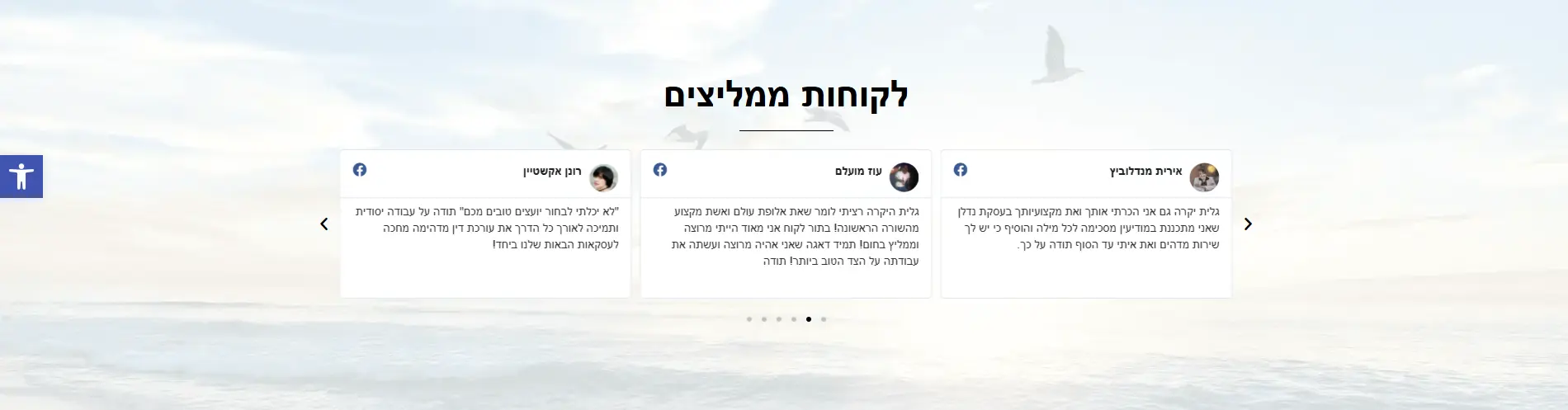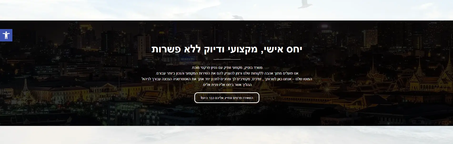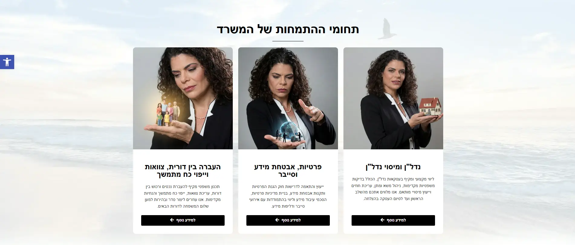 אתר תדמית אלגנטי ומדויק שנבנה עבור משרד עורכי דין, במטרה לשדר מקצועיות, אמינות וניסיון רב שנים. הפרויקט שם דגש על היררכיית תוכן ברורה, עיצוב נקי וחוויית משתמש שמובילה את המבקר במהירות להבנת תחומי ההתמחות וליצירת קשר.
